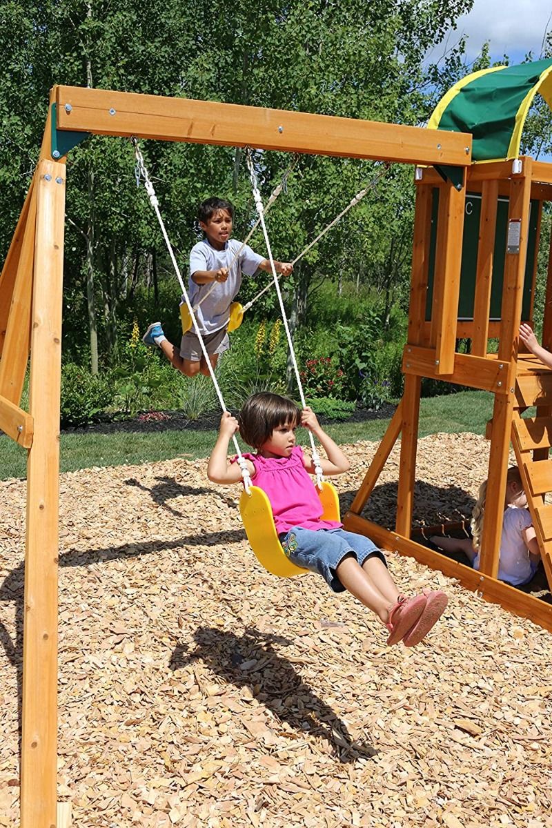 - Due altalene con cintura di colore giallo brillante e corde morbide al tatto per garantire comfort e sicurezza.