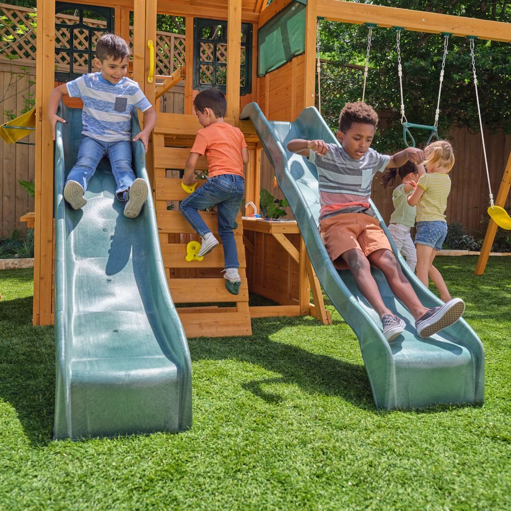 Le barre di legno per arrampicarsi diventano il modo più audace per superare una cascata. Con due livelli di club house, c’è anche ampio spazio per un po’ di tempo libero. Usate la parte superiore come luogo di ritrovo con tutti i vostri amici. Le finestre al piano superiore sono persino dotate di coperture in rete per aiutare a bloccare il sole e a mantenere l’ambiente più fresco. Preparate un banchetto in giardino sul piano cottura e servitelo ai vostri ospiti sul davanzale della finestra e sulla zona delle panche.