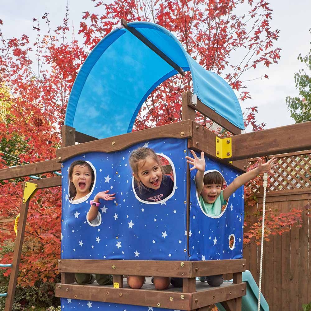 Con le caratteristiche classiche dei playset che i bambini adorano, insieme a un paio di novità, l’altalena in legno Overlook Challenge di è pronta a scacciare la noia dal giardino. Adatto a qualsiasi livello di abilità, un trio di altalene (2 a cinghia e un’acrobar) è pronto per emozionanti corse ad alta quota. Una parete di roccia colorata invita gli esploratori a raggiungere la terrazza ombreggiata (grazie al fantastico tetto curvo in tela). Usate i cerchi ritagliati nelle pareti in tela per osservare la fauna selvatica, lanciare oggetti o giocare a nascondino con mamma o papà. Uno scivolo ondulato offre una discesa a terra divertente. Per gli scalatori più esperti, le nostre barre di sicurezza rialzate contribuiscono a prolungare il divertimento. Afferrate le barre ondulate sulla struttura inclinata per un’emozionante salita verso la cima. Genitori e bambini apprezzeranno il gioco creativo e attivo senza sosta offerto dall’altalena Overlook Challenge.