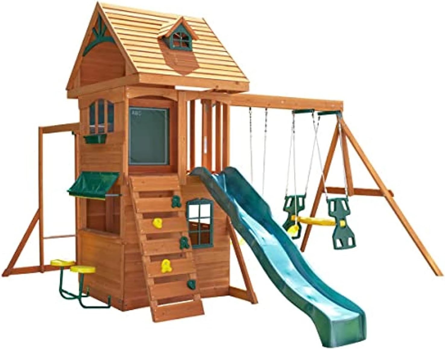 È un set da gioco. È un’altalena. È una club house e molto altro. Progettato per ospitare fino a nove bambini attivi contemporaneamente, il set da gioco Ridgeview Deluxe Club House di, dalle prestazioni eccezionali, offre una vasta gamma di funzionalità, come uno scivolo a onda con corrimano alto, extra profondo e super irregolare (extra divertente) e una parete rocciosa/scala di accesso alla grande club house superiore. I piccoli primati possono dondolarsi sulle solide barre di legno per arrampicarsi, o lanciarsi sulle due altalene a nastro e sul velivolo di alta qualità. Al piano inferiore, un finto bar è aperto 24 ore su 24, 7 giorni su 7, completo di sportello per le ordinazioni, due sgabelli, bancone per il servizio e una tettoia colorata. Al piano superiore, futuri insegnanti e artisti adoreranno discorrere sul telo lavagna in vinile. Nel frattempo, mamma e papà possono rilassarsi e godersi la costruzione in legno di prima qualità al 100% di Ridgeview, le attraenti vernici adatte ai bambini e i dettagli curati nei minimi dettagli (come le finestre a abbaino, il tetto a doghe sovrapposte e la fioriera).